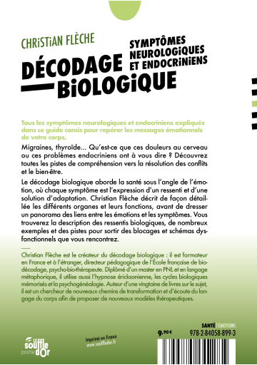 Migraines, thyroïde... Qu’est-ce que ces douleurs au cerveau ou ces problèmes endocriniens ont à vous dire ? Découvrez toutes les pistes de compréhension vers la résolution des conflits et le bien-être. Le Décodage Biologique aborde la santé sous l’angle de l’émotion, où chaque symptôme est l’expression d’un ressenti et d’une solution d’adaptation. Christian Flèche décrit de façon détaillée les différents organes et leurs fonctions, avant de dresser un panorama des liens entre les émotions et les symptômes. Vous trouverez la description des ressentis biologiques, de nombreux exemples et des pistes pour sortir des blocages et schémas dysfonctionnels que vous rencontrez.
