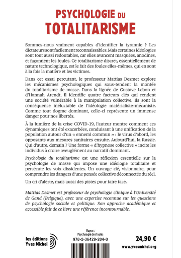 Dans Psychologie du Totalitarisme, Mattias Desmet, professeur de psychologie clinique, analyse les mécanismes psychologiques qui rendent les sociétés modernes vulnérables aux dérives autoritaires. L’auteur met en lumière quatre facteurs décisifs : l’isolement social, le sentiment de vide existentiel, l’anxiété diffuse et l’insatisfaction générale. Ces conditions favorisent ce qu’il appelle la « formation de masse », un phénomène qui conduit les individus à adhérer à des narratifs collectifs au détriment de leur esprit critique. À la croisée de la psychologie, de la philosophie et de la politique, cet essai propose une lecture percutante du totalitarisme contemporain, non plus imposé par la force brute, mais par l’adhésion inconsciente des masses.