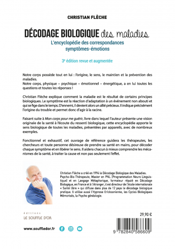 Christian Flèche propose un décodage des symptômes, organe par organe et système par système, permettant de trouver le conflit à l’origine de chaque maladie et accompagner la guérison. Quelle est la cause de mon diabète ? Pourquoi ai-je fait de l’eczéma bébé ? Comment mon estomac supporte-t-il ses embarras perpétuels ? Nous recherchons tous des réponses à nos maux corporels. Pour pouvoir agir sur la prévention des maladies, il est utile de savoir décoder nos fonctionnements biologiques, en se reconnectant à l’émotion, révélatrice du ressenti corporel, et déclencheur, dans un environnement donné, d’une maladie. C’est ce que démontre Christian Flèche, auteur déjà reconnu pour ses ouvrages de référence sur la santé, la gestion des émotions et la connaissance de nos conflits intérieurs.