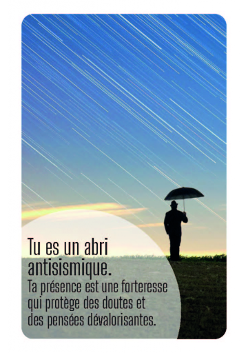 • Prenez un instant d’introversion. Tirez une carte et servez-vous de son message pour développer de la bienveillance à votre égard. Ce blessing vous donnera des ailes pour démarrer une tâche ou votre journée.