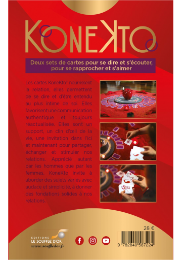 Deux sets de cartes pour se dire et s’écouter, pour se rapprocher et s’aimer. Les cartes KoneKto® nourrissent la relation, elles permettent de se dire et d’être entendu au plus intime de soi. Elles favorisent une communication authentique en intégrant les grands principes de la communication non violente. Elles sont un support, un clin d’oeil de la vie, une invitation dans l’ici et maintenant pour partager, échanger et stimuler nos relations.