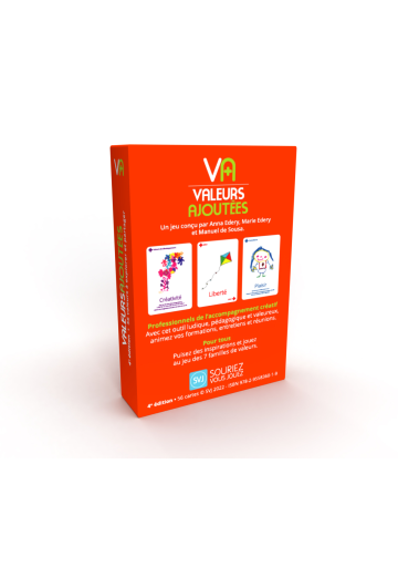 Valeurs ajoutées fait un jeu de ce qui nous anime et nous unit : nos valeurs. Ce jeu de 56 cartes grand format est conçu pour être utilisé aussi bien par les acteurs de l’entreprise et des ressources humaines (DRH, formateurs, coachs, thérapeutes) que par les particuliers. C’est à la fois un outil d’accueil, d’ouverture et de présentation, de projection, de réflexion, d’élaboration, un outil d’identification, de partage et de sensibilisation aux valeurs de l’entreprise, un outil de connaissance de soi, de soi et des autres, un outil ludique, par son côté aléatoire et son utilisation en jeu des 7 familles et un cadeau éthique et pédagogique.